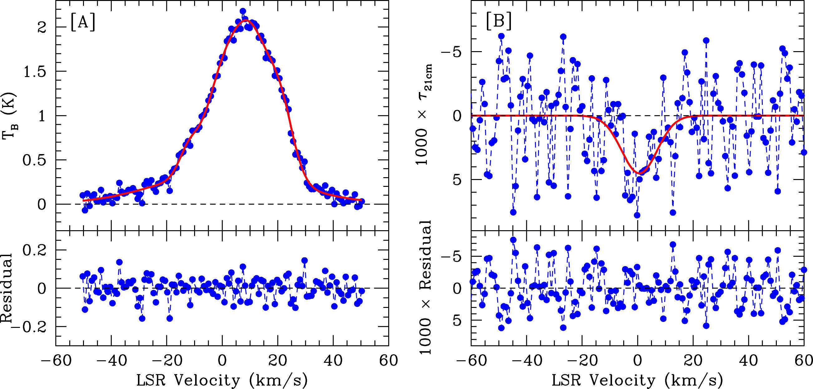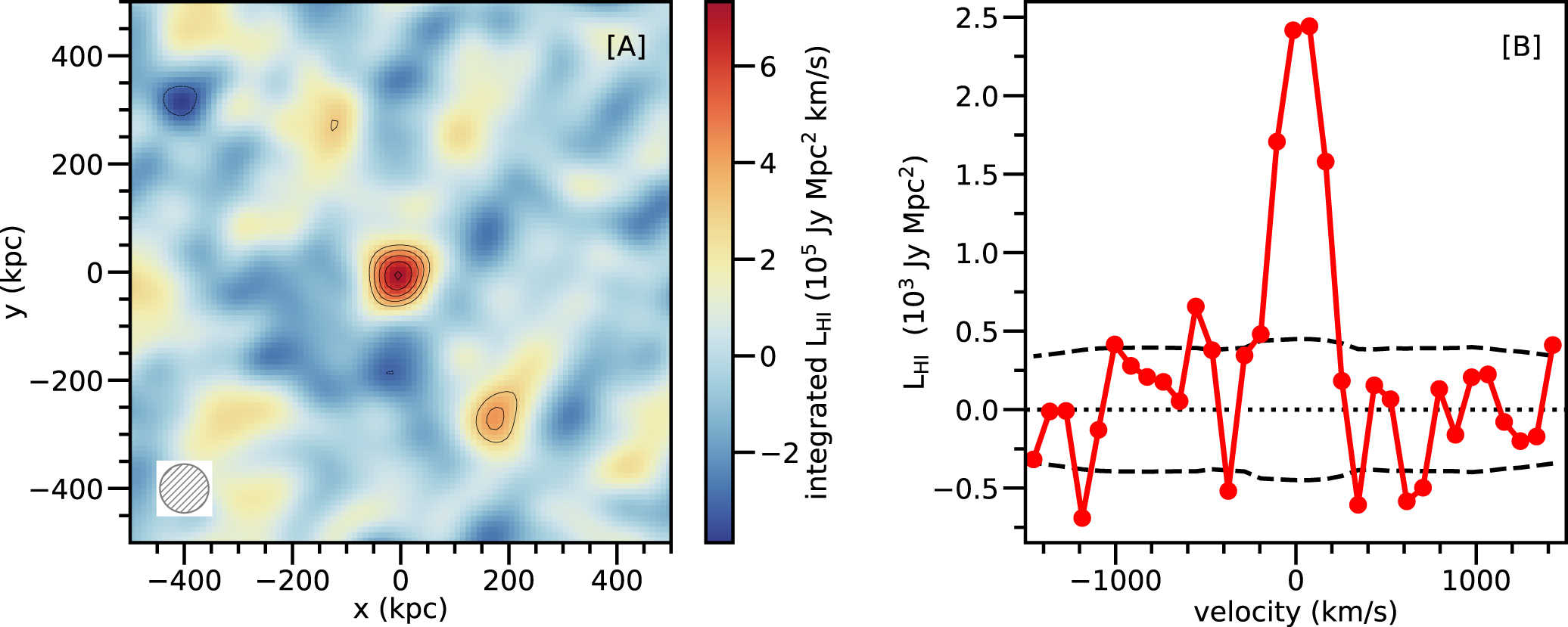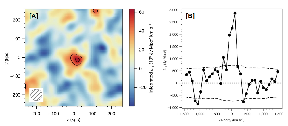 Baryonic processes in galaxy evolution include the infall of gas onto galaxies to form neutral atomic hydrogen (HI), which is then converted to the molecular state (H2), and, finally, the conversion of H2 to stars. Understanding galaxy evolution thus requires an understanding of the evolution of stars and of neutral atomic and molecular hydrogen. For the stars, the cosmic star-formation rate density is known to peak at redshifts between 1 and 3, and to decline by an order of magnitude over the subsequent 8 billion years; the causes of this decline are not known. For the gas, the weakness of the hyperfine transition of HI at 21 cm wavelength — the main tracer of the HI content of galaxies—means that it has not hitherto been possible to measure the atomic gas mass of galaxies at redshifts higher than about 0.4; this is a critical gap in our understanding of galaxy evolution. Chowdhury et. al. report a measurement of the average HI mass of star-forming galaxies at a redshift of about one, obtained by stacking the HI 21 cm emission signals from 7,653 galaxies over a 1.2 square degree region of the sky. The figure shows [A] the stacked HI 21 cm emission map and [B] the stacked HI 21 cm emission spectrum; the detection of the average 21cm emission signal can be clearly seen in both panels. The measured average HI mass of the sample of galaxies at z~1 is similar to the average stellar mass of the sample but the HI mass can fuel the observed star-formation rates for only 1 to 2 billion years in the absence of fresh gas infall. This suggests that gas accretion onto galaxies at redshifts of less than one may have been insufficient to sustain high star-formation rates in star-forming galaxies. This is likely to be the cause of the decline in the cosmic star-formation rate density at redshifts below one.
