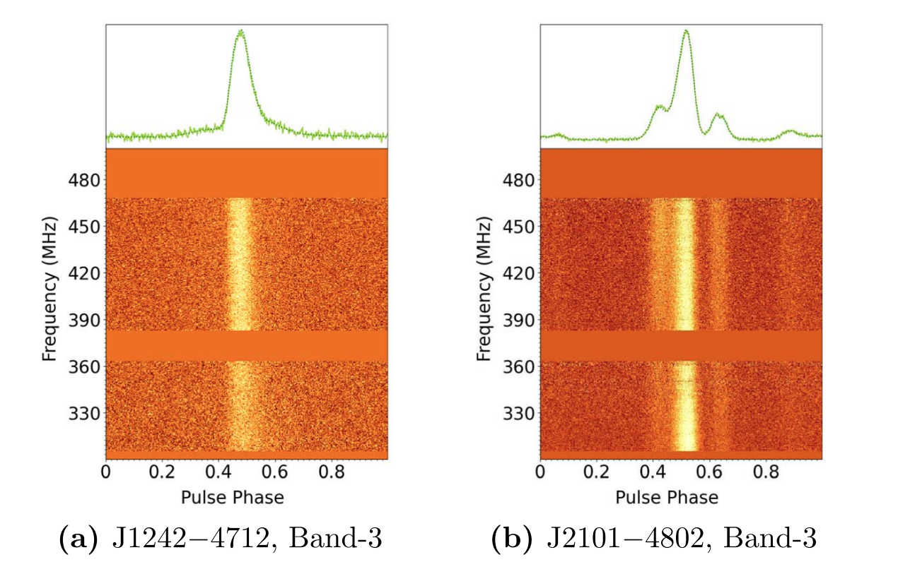 Millisecond pulsars (MSPs) are rapidly rotating neutron stars, from which we observe pulses having extremely stable rotational periodicity as the beams of radiation sweep across our line of sight. This makes MSPs the most accurate celestial clocks. Searching for pulsations of unknown MSPs in the gamma-ray band is extraordinarily computationally expensive due to the scarcity of photons, particularly in the case of binaries where the MSP revolves around its companion. While gamma-ray searches have been possible in a few cases, it is generally far more efficient to first search for radio pulsations in the direction of the gamma-ray sources, to identify the pulsar period. Bhattacharyya et al. used the Giant Metrewave Radio Telescope (GMRT) at 322 MHz and 607 MHz to search for radio pulsations in the directions of 375 unassociated Fermi Large Area Telescope (Fermi-LAT) gamma-ray sources. They identified three new MSPs, PSR J0248+4230, PSR J1207-5050 and PSR J1536-4948, named after their locations in the sky. After the discovery, the authors conducted regular timing follow-up observations for about 5 years with the GMRT to pin down the pulsar periods, period derivatives, sky positions, and parameters related to the pulsars' orbits. They then folded the gamma-ray photons from the three MSPs from the Fermi-LAT data with the parameters derived from the GMRT observations, resulting in the detection of gamma-ray pulsations as well. They find that PSR J0248+4230 and PSR J1207-5050 are isolated MSPs, with periods of 2.60 milliseconds and 4.84 milliseconds. PSR J1536-4948 has a period of 3.07 milliseconds, and is in a binary system with an orbital period of about 62 days about a star whose mass is approximately 1/3rd that of the Sun. PSR J1536-4948 is an unusual MSP with an extremely wide pulse profile in both radio and gamma-rays, a pattern not generally seen in such pulsars. Bhattacharyya et al. examined the pulsar emission models and emission geometries that could account for the observed radio and gamma-ray pulsed emission. PSR J1536-4948 is very bright in gamma-ray, allowing the authors to count every photon emitted from the source from the lowest to the highest energy band of the gamma-ray spectrum, at an accuracy of 1 part in a million. In addition, PSR J1536-4948 shows evidence for very high energy emission (at energies higher than 25 GeV), which is very rare for millisecond pulsars. The figure shows the pulse profiles of the 3 MSPs from the GMRT and Fermi-LAT observations.