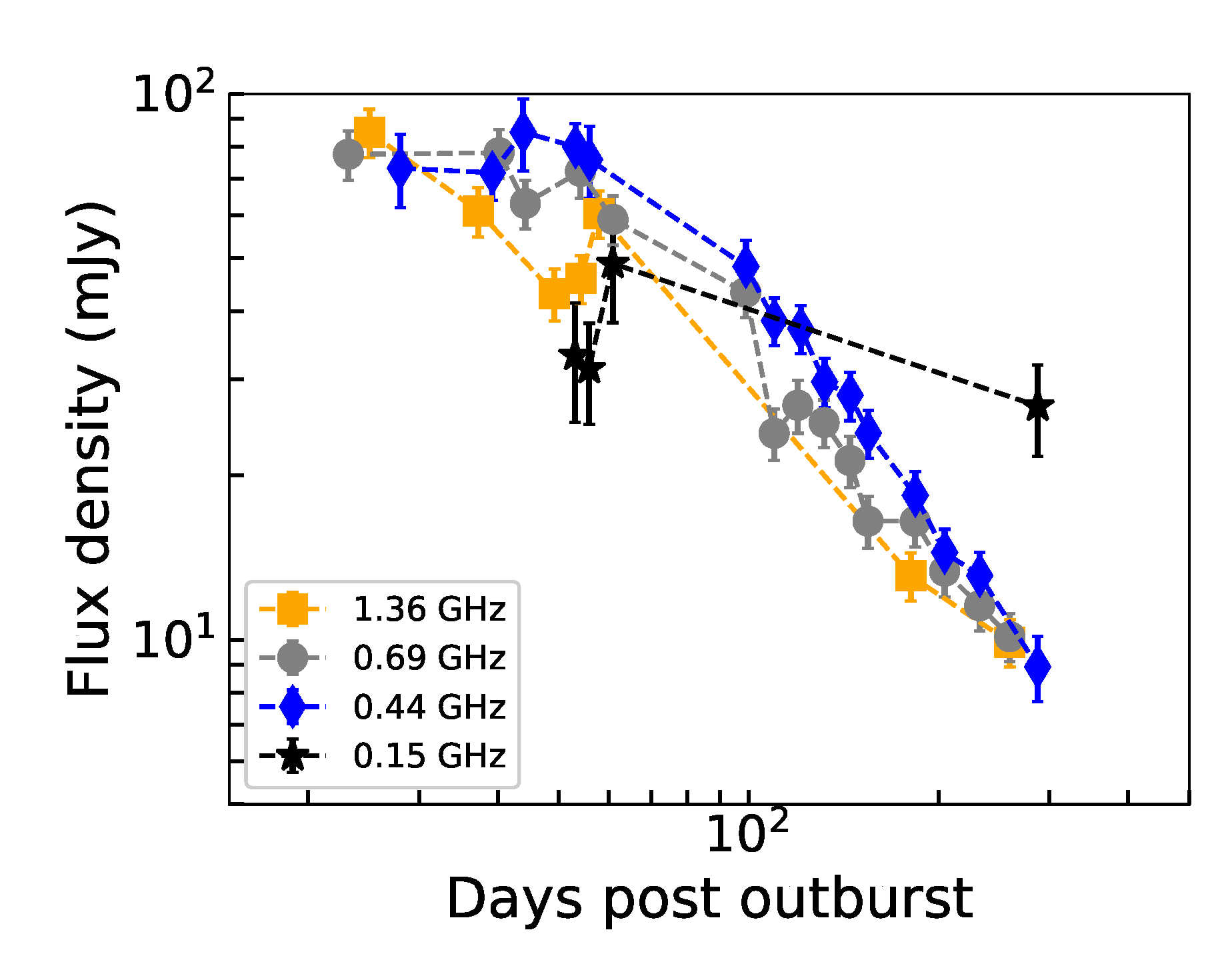 Novae are spectacular astrophysical events that happen in binary systems comprising a white dwarf (WD) and a non-degenerate stellar companion. The WD accretes matter from the companion star and forms a layer at its surface. Once the accreted mass reaches a critical value, the accretion layer undergoes unstable nuclear reactions releasing enormous amounts of energy that leads to the eruption of the accreted envelope. These luminous eruptions are primarily detected as Galactic optical transients termed as novae. Recurrent novae belong to a sub-class of novae with more than one recorded outburst. Low-frequency radio emission from novae is understood to be shock-driven synchrotron radiation that arises due to the interaction between the fast-moving nova ejecta and the stellar wind of the companion star. Studying this radio emission is extremely interesting as it carries information about the shock from the outburst and the density of the circumbinary medium (CBM). However, there are only 3 recurrent novae with detailed low-frequency observations. Nayana et al. (2024) carried out extensive radio monitoring of the 2021 outburst of the Galactic recurrent nova RS Ophiuchi with the GMRT at frequencies of 150 MHz to 1.4 GHz, from 27 to 287 days after the outburst. The radio light curves (see the figure, which which shows the light curves at 1.36 GHz, 690 MHz, 440 MHz, and 150 MHz; reproduced from Nayana et al. (2024, MNRAS, 528, 5528) are best represented by a two-component synchrotron emission model where the emission at early times is suppressed by free-free absorption from the clumpy ionized CBM. The authors interpret the two-component scenario to be a natural consequence of the bipolar ejecta geometry as revealed by the high-resolution radio imaging of Munari (2022). They compare the synchrotron emission from the previous outbursts of RS Ophiuchi, in 1985 and 2006, with that of 2021 and find that the number density of particles in synchrotron-emitting plasma is higher in the 2021 outburst. They obtain a mass-loss rate of the companion star that is consistent with the mass-loss rates of Galactic red-giant branch stars.