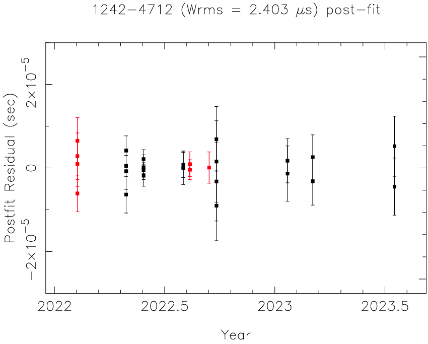 Millisecond Pulsar (MSP) binaries in the Galactic field serve as valuable indicators of binary evolution. After accretion, the intense pulsar wind can wear away the companion star resulting in the creation of MSP binaries with very low-mass companions. These MSPs with mostly hydrogen-rich, nondegenerate companions in compact binary orbits (orbital periods < 1 days) are classified as "spider" MSPs. In these compact systems, the highly energetic wind from the pulsar ablates the companion, leaving ionized material in the orbit which causes an eclipse of the pulsar’s radio emission. Such eclipsing MSP systems can aid in the understanding of properties of the low-mass companions in tight binary orbits, the plasma properties of the eclipse material, mass flow from the companion driven by a relativistic pulsar wind, and orbital properties in a strong gravitational potential. Ghosh et al. 2024 present the timing solution for such a 5.31 ms spider millisecond pulsar (MSP) J1242-4712, discovered with the uGMRT. Using the coherently dedispersed observations from uGMRT bands 3 and 4, they achieved an rms timing residual of 2.4 micro-seconds (see figure). They found that PSR J1242-4712 orbits a companion of minimum mass 0.08 solar masses, with an orbital period of 7.7 hr, and occupies a relatively unexplored region in the orbital period versus companion mass space for the spider MSP population. They also find that PSR J1242−4712 eclipses for a very short duration near superior conjunction of the pulsar (orbital phase ∼ 0.23-0.25) below 360 MHz and reported mini-eclipses at other orbital phases. From the observed eclipses and significant orbital period variability in the timing solution, the authors concluded that PSR J1242-4712 may be a helium star−white dwarf binary, but has a semi- or non-degenerate companion, indicating that this is a "spider" MSP. However, the optical counterpart for this system could not be identified, which is observed for the majority of other redback systems. This optical nondetection could be attributed to reddening due to distance. Positioned within an ambiguous region between the conventional black widow and redback characteristics, this system emerges as a noteworthy and unusual redback variant, with properties common to both black widows and redbacks. The findings of this study suggest a category of millisecond pulsars that share properties bridging these two subclasses of spider binary systems.