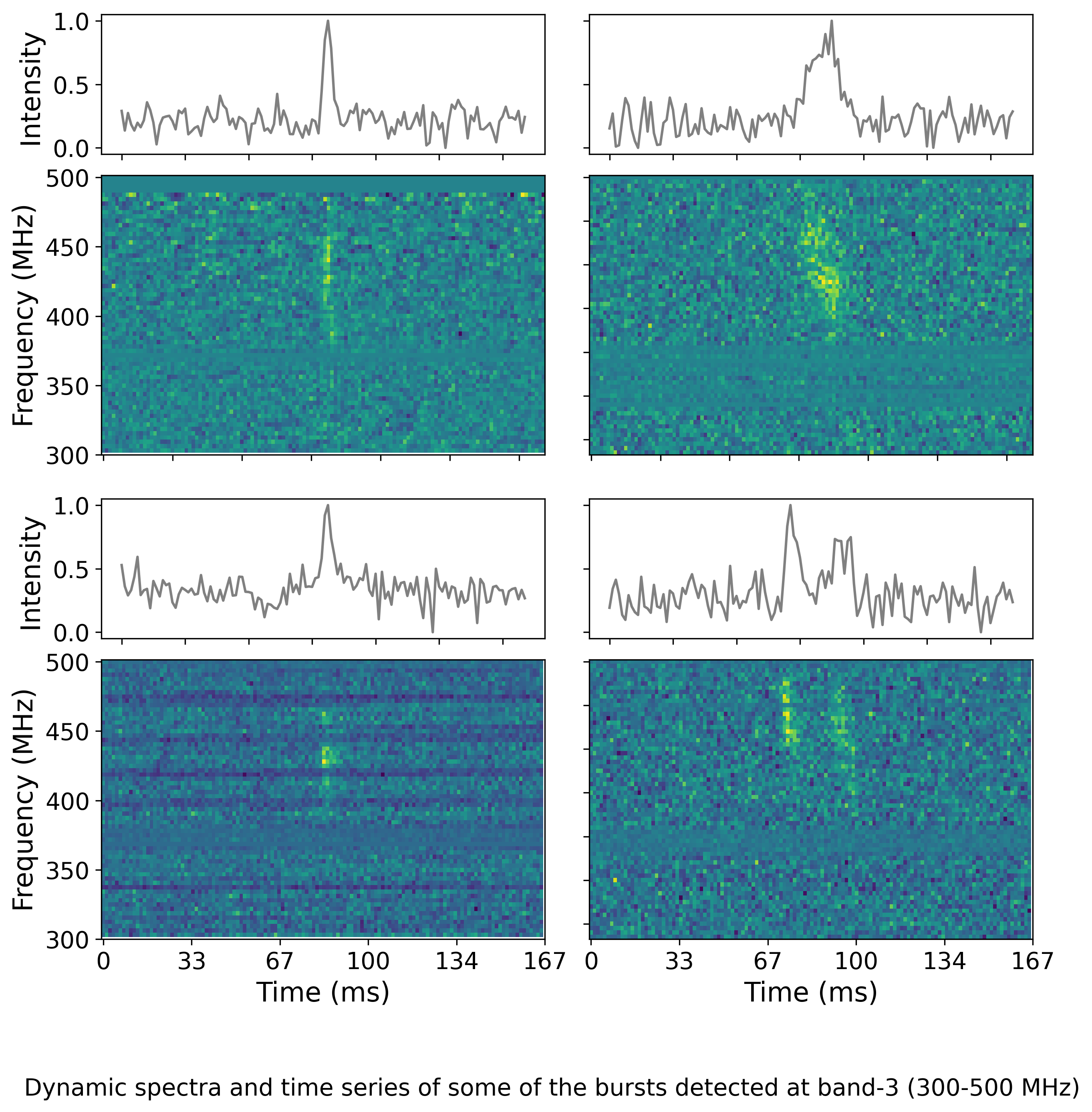 also show interesting, more detailed, frequency structures. A sample of the magnetar bursts demonstrating the spectral as well as temporal structures is shown in the accompanied figure. To probe any physical link between the bursts of the magnetar and the repeating FRBs, as well as to understand the underlying emission mechanism, the magnetar is currently being monitored using the GMRT.
