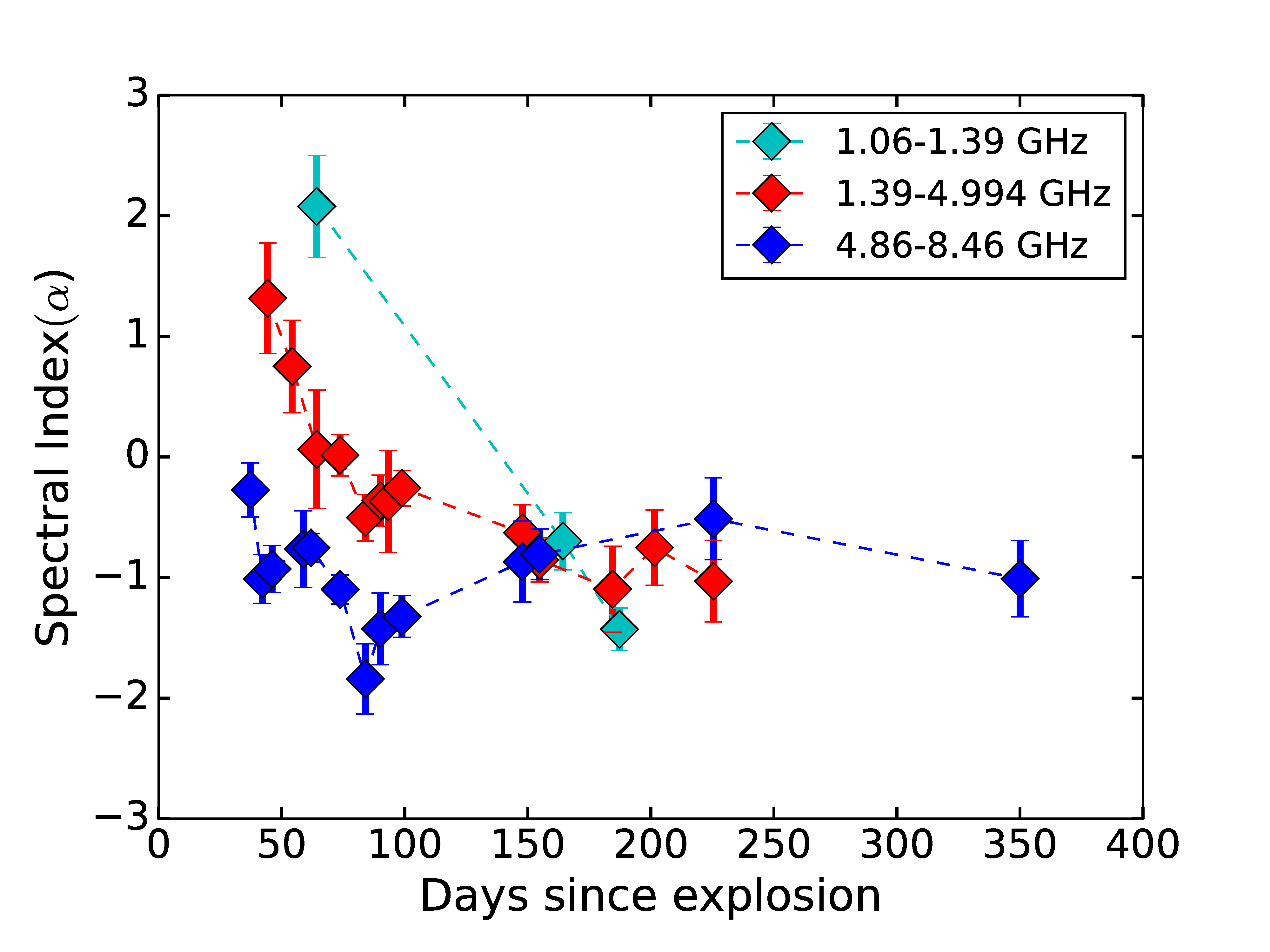 Radio emission from core-collapse supernovae carries information about the progenitor stellar system and immediate circumstellar environment. Nayana et al. used the Giant Metrewave Radio Telescope (GMRT) and the Very Large Array (VLA) to carry out a radio study of a Type IIP supernova, SN 2004dj, observing the source over both a wide range of frequencies (0.24 - 43 GHz) and a long time interval (covering ages from around 1 day to around 12 years after the discovery of the supernova). The wide frequency and temporal coverage allowed the authors to perform detailed modelling of local conditions in the supernova environment. Assuming a progenitor stellar wind velocity of 10 km/s, they infer the mass-loss rate of the progenitor star to be approximately a millionth of a solar mass per year. The derived value of the shock deceleration parameter is suggestive of a mildly decelerating blast wave. They studied temporal variation of the radio spectral indices between multiple frequency pairs (the figure shows the evolution of the spectral indices measured between frequencies of 1.06 and 1.4 GHz, 1.4 and 4.9 GHz, and 4.9 and 8.46 GHz), finding that the spectral indices steepen to values of -1 for an extended period from around day 50 to around day 125 after the explosion, especially at higher frequencies (between 4.86 and 8.46 GHz). This is indicative of electron cooling at the supernova shock. They calculate the cooling time scales and break frequencies for both synchrotron cooling and inverse-Compton cooling, and suggest that the steepening in spectral indices is due to inverse-Compton cooling of relativistic electrons at the supernova shock.