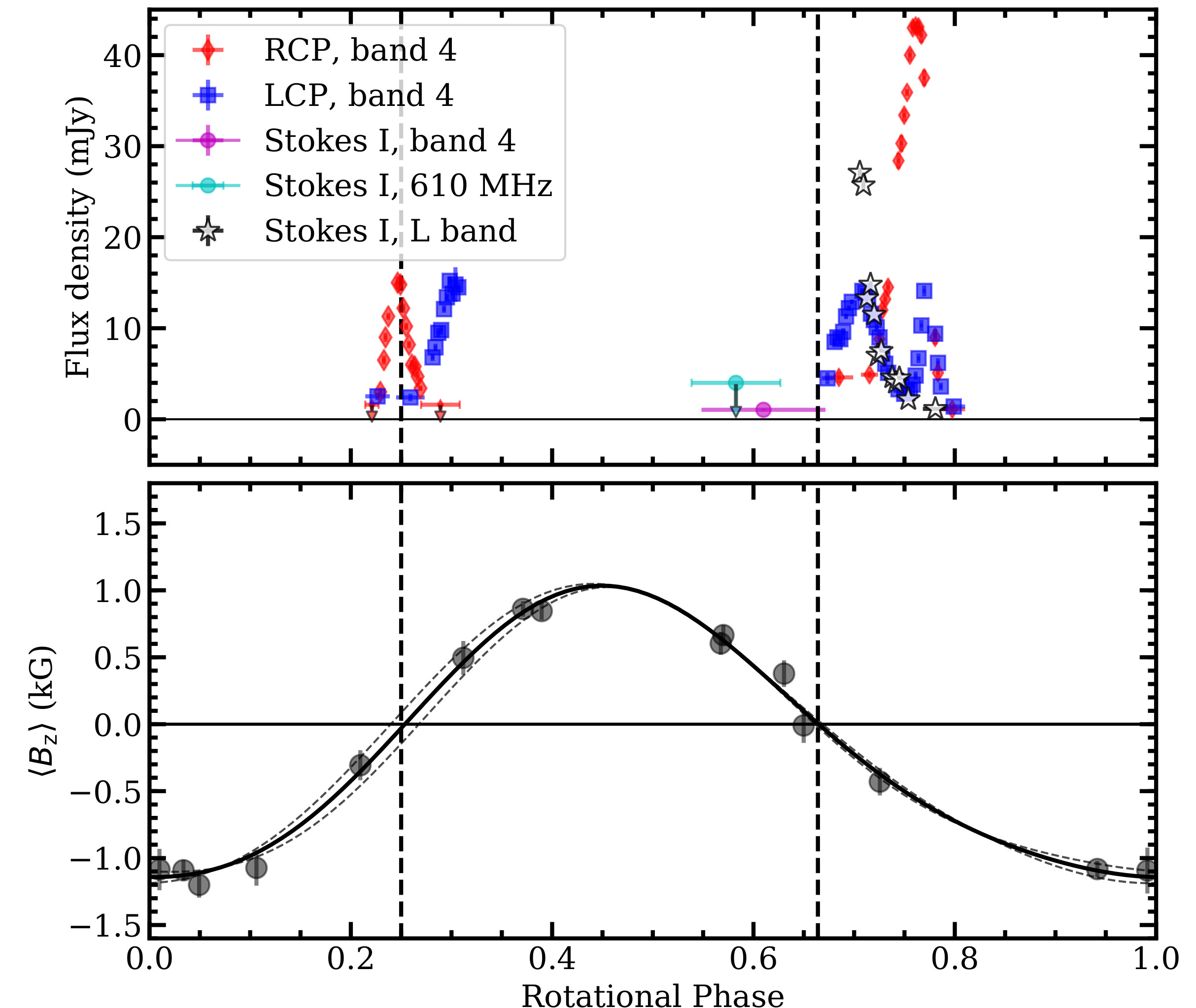 Radio emission from hot magnetic stars usually arises from the gyrosynchrotron process. However, a small number of these stars have been found to produce coherent radio emission generated by the Electron Cyclotron Maser Emission (ECME). This emission is observed in the form of highly circularly polarized pulses that arise close to rotational phases where the longitudinal magnetic field of the star is zero (i.e. the magnetic null phase). In the present work, Das et al. used upgraded Giant Metrewave Radio Telescope (uGMRT) observations to confirm the presence of ECME from another star, HD 142990, at frequencies ~550-850 MHz (speculated to be a possibility by Lenc et al. (2018), based on their detection of highly circularly polarized emission from the star with the Murchison Widefield Array). Das et al. observed the star around both the magnetic null phases, and found significant flux density enhancement in both circular polarizations near both magnetic nulls, consistent with the hypothesis that the detected emissions arise from the ECME mechanism. The ECME pulses are, however, peculiar in the sequence of arrival of the two circulate polarizations, with the observed pattern matching that from neither the extra-ordinary mode (X-mode) nor the ordinary mode (O-mode). Das et al. found that both circular polarizations at 550-850 MHz appear to originate near the same magnetic pole, which has not been observed earlier. To explain this unique observation, the authors propose a scenario involving a transition between magnetic-ionic modes. This observation of mode transition, if confirmed, will be the first of its kind in hot magnetic stars. Further observations at frequencies both above and below the range 550-850 MHz will be needed to test the validity of this hypothesis. The upper panel of the figure shows the variation of the flux density of the star at different GMRT frequency bands. Band 4 corresponds to the frequency range 550-850 MHz and L-band, to 1420 MHz. RCP and LCP stand for right and left circular polarization, respectively. The lower panel shows the variation of the star's longitudinal magnetic field; the latter data were obtained from Shultz et al. (2018). The enhancements in flux density occur close to the magnetic null phases, which is expected for ECME.