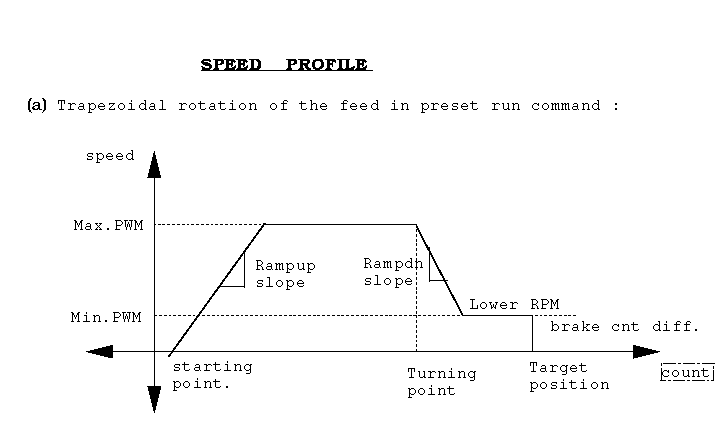 1. The speed begins to ramp up from the starting point until it reaches to the maximum PWM where it remains constant till the turning point difference is reached.When the turning point difference is reached, the speed begins to ramp down till lower RPM reaches.Once the lower RPM is reached , speed remains constant till it reaches the brake count difference,Then the brakes are applied at the target position.